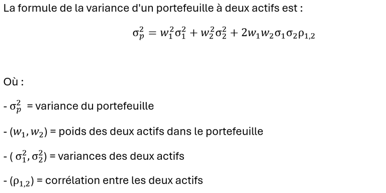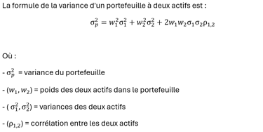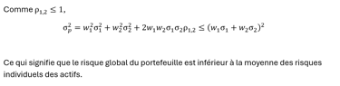 - S'il n'y a pas de corrélation (=0), la variance du portefeuille est inférieure à la moyenne pondérée des variances individuelles, mais pas nulle.