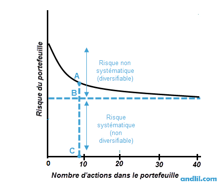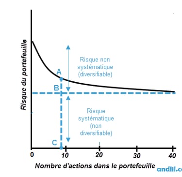 Pour un portefeuille d’actions, il est généralement admis par les investisseurs que le risque non-systématique (ou spécifique à une action) peut être drastiquement réduit avec une vingtaine de positions (à condition que les positions soient suffisamment décorrélées et que leurs pondérations soient équilibrées), comme le montre le graphe ci-dessus. Au-delà, l’ajout de titres supplémentaires n’apporte plus qu’un bénéfice mineur.