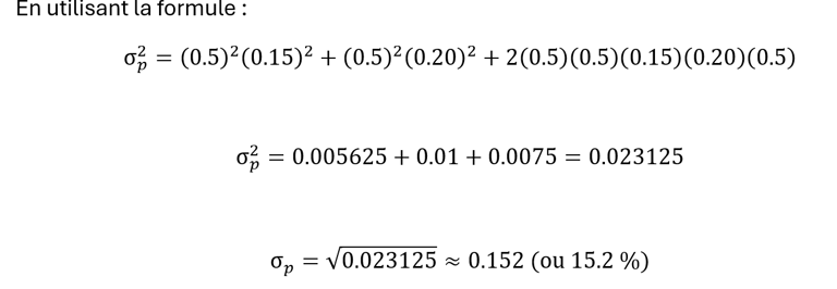 L'écart-type du portefeuille (15,2 %) est inférieur à la moyenne des deux écarts-types individuels (17,5 %). Cette réduction du risque est la puissance de la diversification.