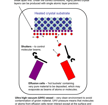 Dans le cas de la MBE, il s’agit d’une forme de dépôt sous vide où les matériaux sont évaporés dans un environnement à ultra-vide (Ultra-High Vacuum, UHV) et dirigés sous forme de jets moléculaires ou atomiques sur un substrat cristallin chauffé. Ce procédé permet un contrôle précis de la composition, du dopage et de l’épaisseur des couches déposées, facilitant ainsi la création d’hétérostructures complexes avec une précision à l’échelle atomique.