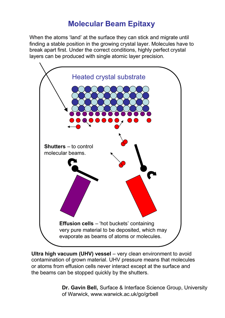 L’épitaxie par jets moléculaires (Molecular Beam Epitaxy ou MBE) est une technique avancée de dépôt d’éléments chimiques utilisée pour produire des couches cristallines de haute qualité à l’échelle atomique.